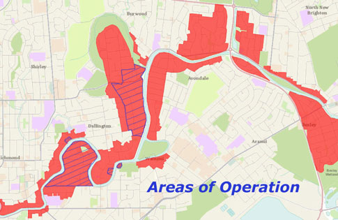 The residential red zone is located in eastern Christchurch, from the CBD to Bexley. There are plans to accelerate demolition in the zone to clear suburbs on the flat land by the end of 2014. It is likely to remain deserted for a few years following the demolition programme, until longer-term decisions are made.